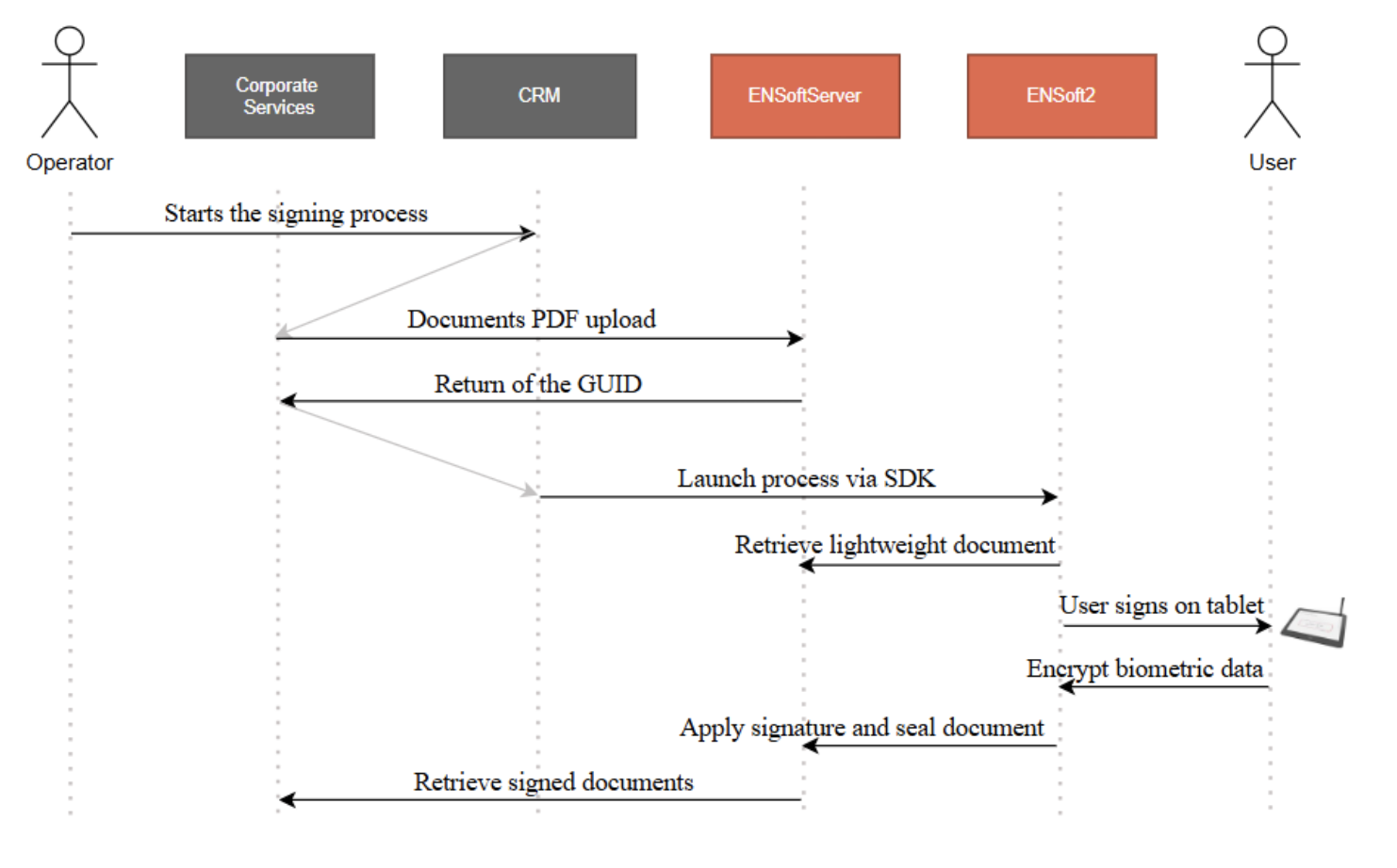 - Corporate frontend calls ENSoft2 via SDK to start the signing process.